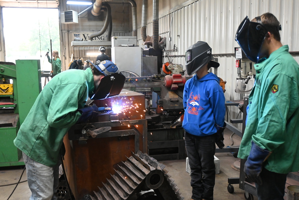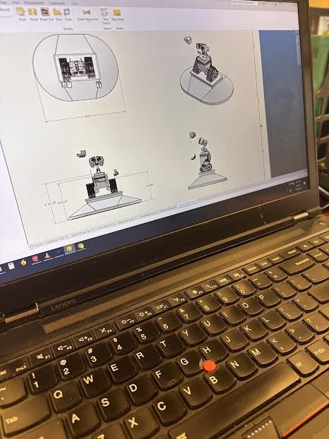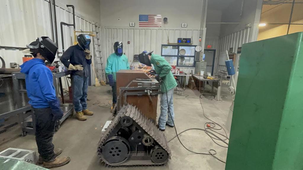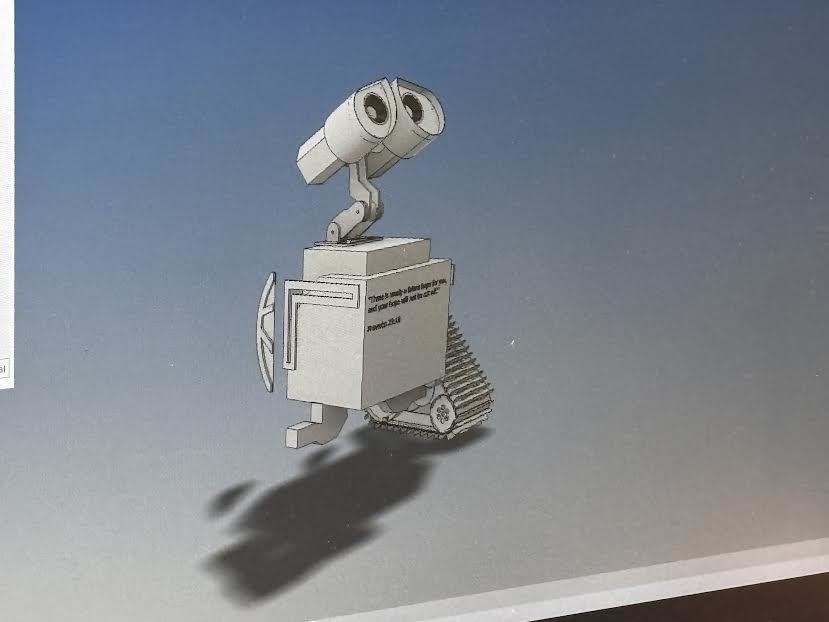 For several years, drafting teacher Bruce Rea, and drafting and welding students, have worked on drafting CADD designs, cutting metal on the plasma cutter and welding together the pieces for a large, metal outdoor art installation for Bruce and Jodie Rea's property. The piece is a nonfunctioning, rough replica of the WALL-E robot, raising up a boot with one hand. When complete , the hand with the boot will stand about 10 feet tall, giving some context to the size of the completed ornamental art piece. The metal robot will rust naturally outdoors. Welding teacher Travis Brumback said he anticipates his students will finish the project this year.