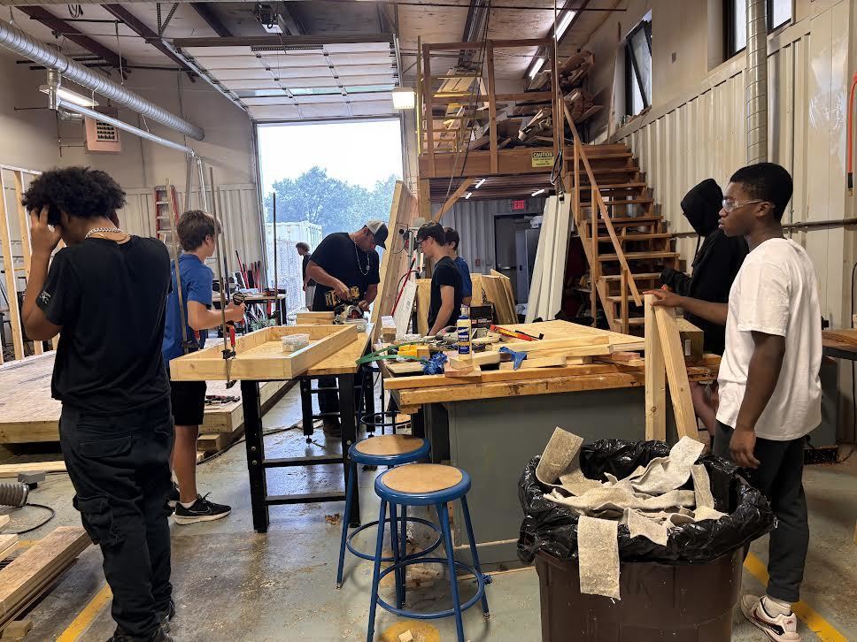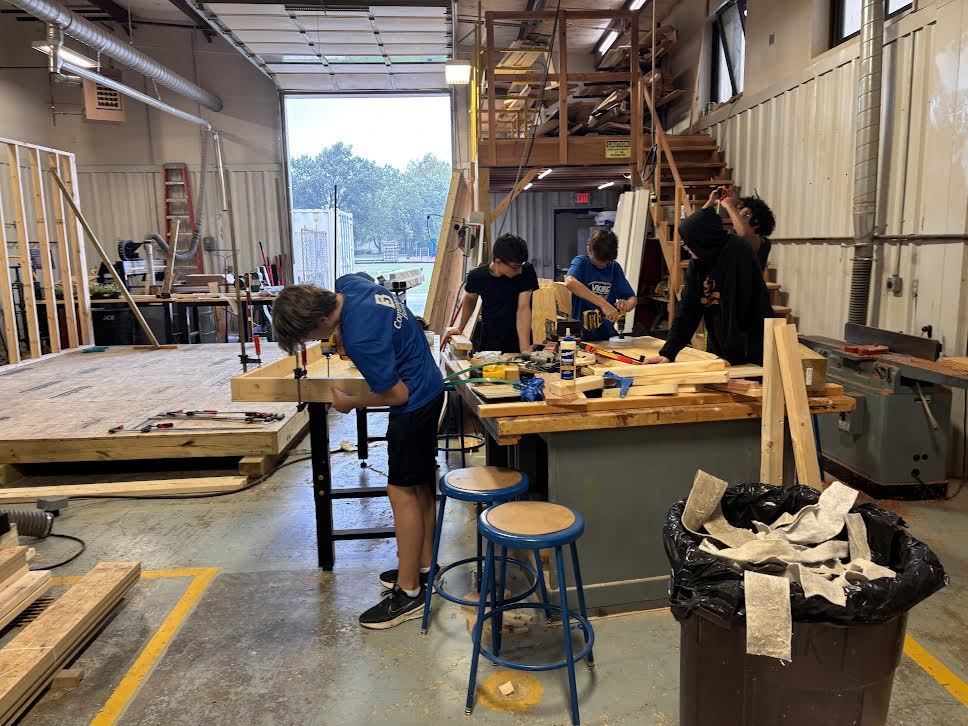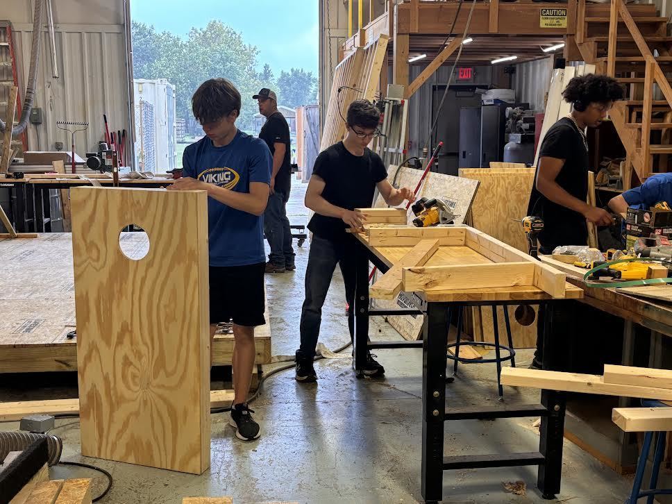Students in Mr. Gilpin's class work on constructing cornhole games, one of a multitude of projects underway in the woodshop.