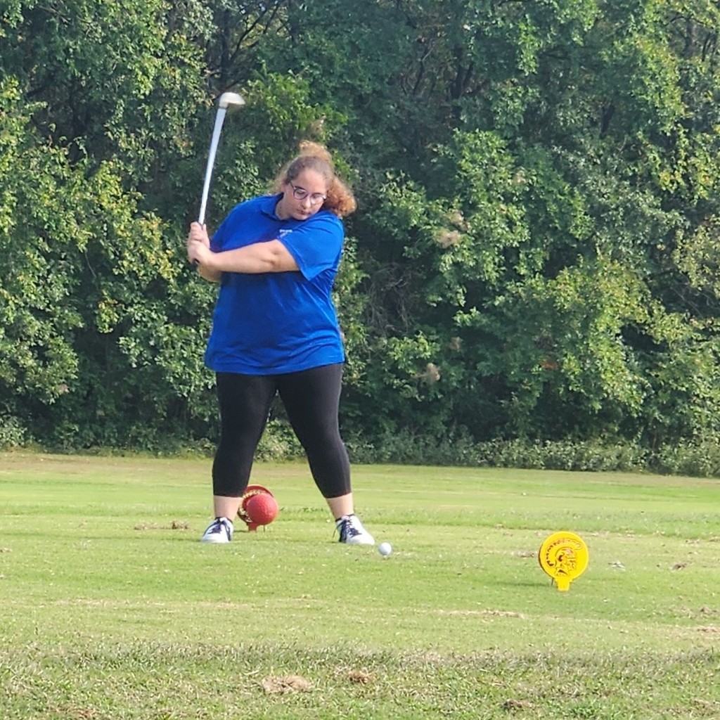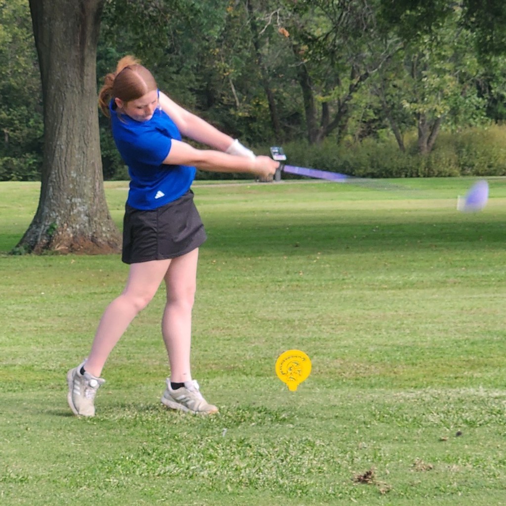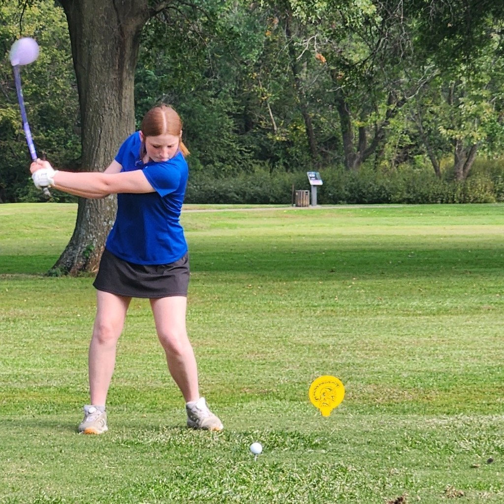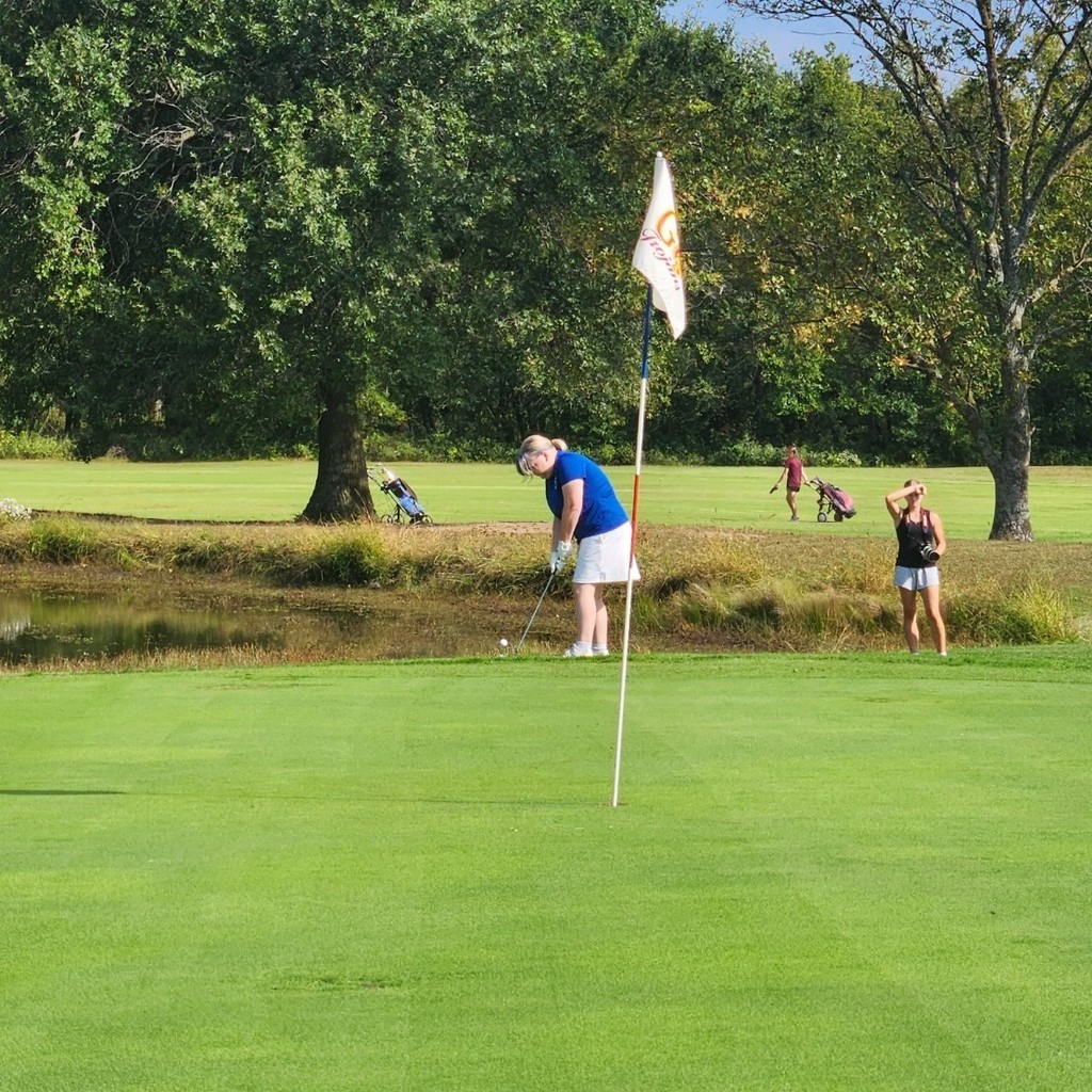 Raeleigh showing a nice straight arm in her backswing on number 7. She stayed out of the pond!
