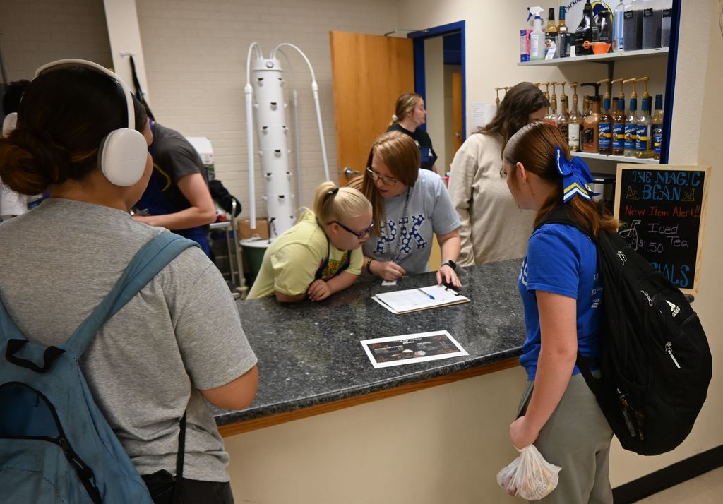 Students line up at the counter to place orders while others line up for taste tesing Italian soda.