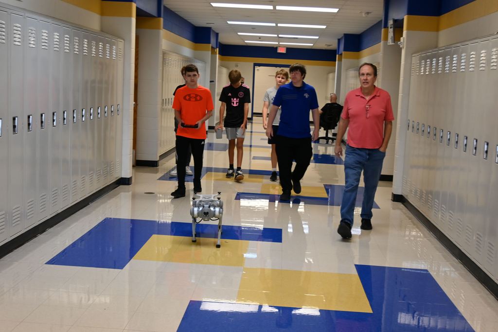 Five students walk down the hall with Bruce Rea, while one operates the controls to Vector, the robotic dog.